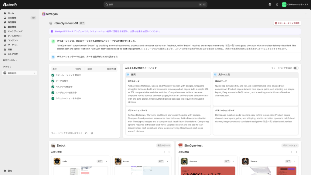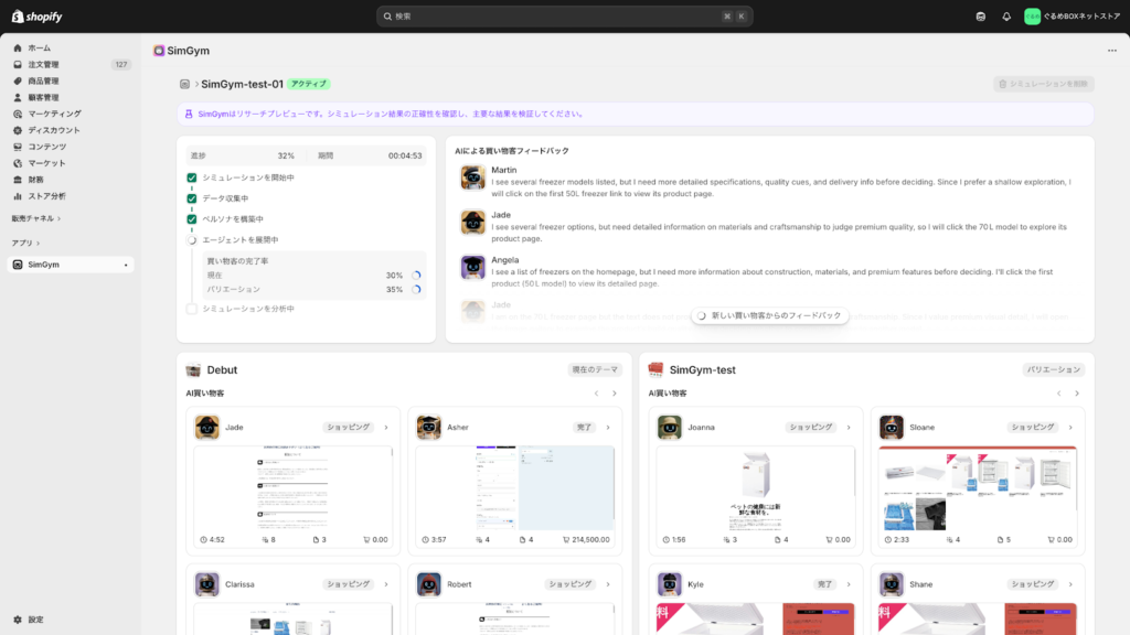 Shopifyが提供する公式アプリ「 SimGym 」のAIリサーチプレビュー版が日本でもローンチされました。このアプリは、AIを搭載した仮想の「買い物客」を使って、ストアのテーマ変更やデザイン調整が顧客の行動にどう影響するかを、公開前にテスト(シミュレート)できるツールです。他社にはない、Shopifyオリジナルの「自動A/Bテスト+購入テスト機能」として注目を集めています。