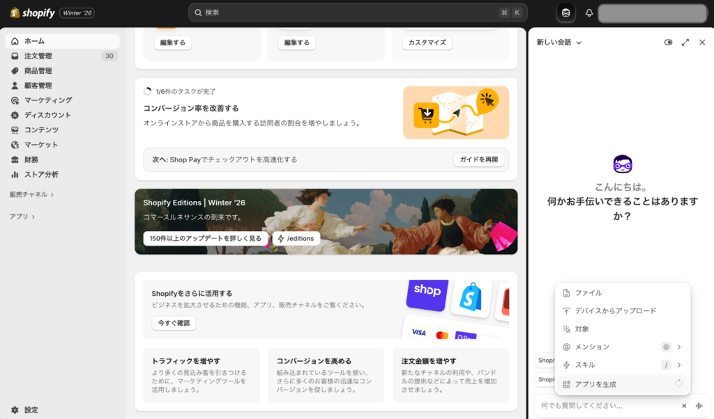 Shopify Editions 26 winterで、Sidekickを使ってカスタムアプリを作成できる機能が発表されました。アイデアを文章で伝えるだけで、Shopify管理画面内で動作するアプリのたたき台を生成できます。